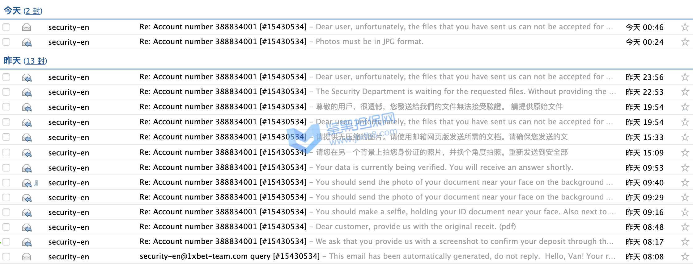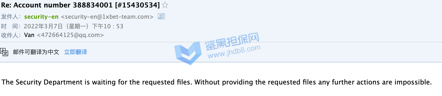 2022年3月1日我在1xbet充值了1万8的金额,想买各种比赛,到昨天3月7日,因为运气好,这个1万8的金额已经变成了6万元,我想取款,结果得到的消息是必须连续安全部分审核,我好奇为何注册的时候,存款的时候没有让我注册,但是也没多犹豫。随后就开始了一系列莫名其妙且扯皮的的过程。首先是一个说英文的客服回复我,让我提供银行流水证明,还必须是原件,带公章的,中国银行刚好可以开具这部分信息,我就提供了,然后让我提供身份证正反面,我也提供了,最奇葩的来了,让我把身份证放脸旁边拍一个自拍,带上他发我的那个邮件,这个有点过分了,但是我还是照着要求做了,随后他和我说资料审核结束,随后会有人联系我。我等了好久还是没有人联系我,我就主动发邮件询问,结果这次是个中文客服回复我,让我在不同的角度再拍一次身份证照片,我照做了,然后以文件大小不足1m为由让我重拍,我重拍之后,又换了个英文客服,说我提供的不是源文件,无法受理。我之后用不同角度/不同光线/甚至是扫描件发送我的身份证照片,都和我说不是他们要的文件,我随后发了我的护照照片,也是扫描件,一开始回复我要jpg照片文件,我发了以后,又回复我说不是他们要的文件了。这一系列过程下来让我觉得他们就是在刁难我,甚至是在骗取我的个人信息。希望鉴黑网可以帮我一下,帮我追款,谢谢。我的1xbet账号是388834001